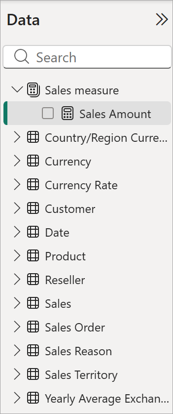 Klik in Verkoopmetingen met de rechtermuisknop op Kolom1 en selecteer Verbergen in de rapportweergave. Deze wijziging maakt verkoopmetingen een maateenheidgroep, die nu boven aan het deelvenster Gegevens wordt weergegeven met een pictogram van een maateenheidgroep, zoals deze: