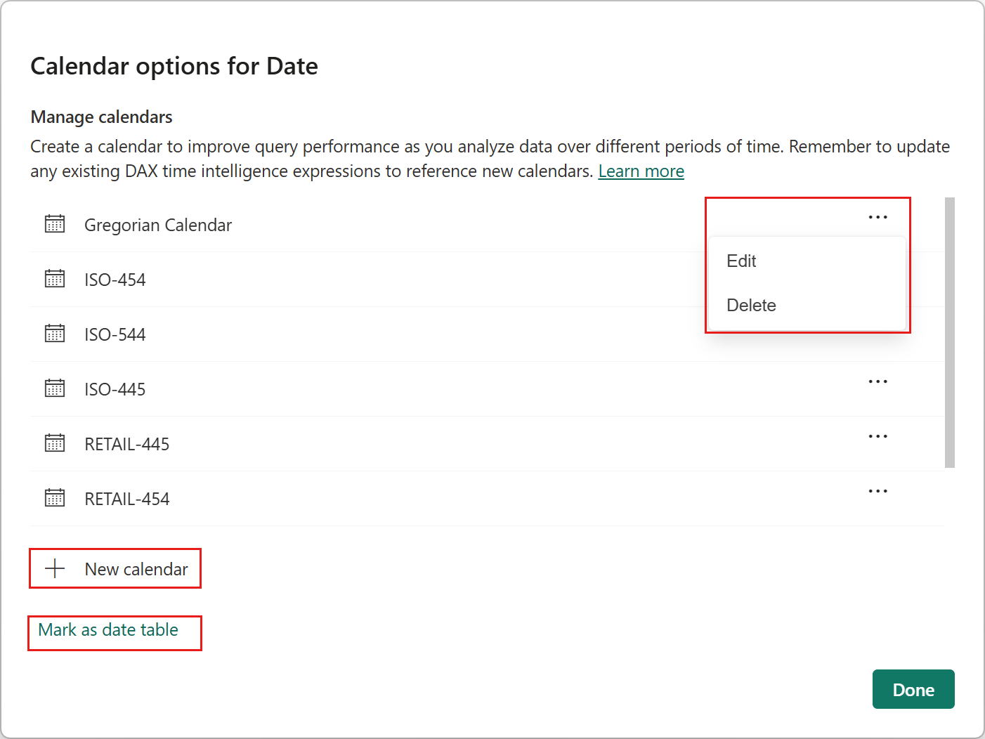 - Tijdintelligentie op basis van een agenda (preview). Nieuwere optie, maar vereist wat meer werk om in te stellen. Het biedt echter ook betere prestaties, meer flexibiliteit om te werken met niet-Gregoriaanse kalenders en de mogelijkheid om op week gebaseerde berekeningen uit te voeren.