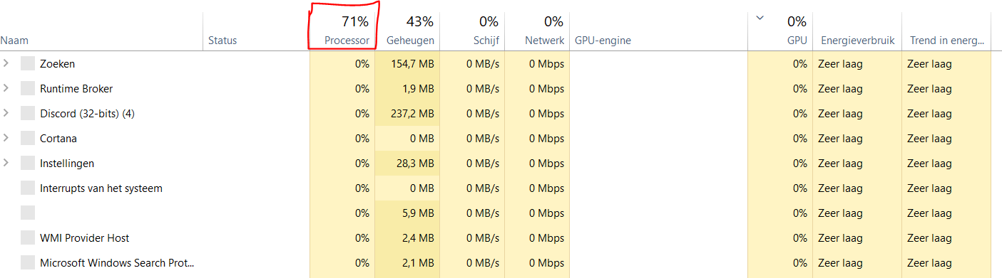 Willekeurige apps verschijnen bovenaan in Taakbeheer als ik Taakbeheer sorteer op meest CPU gebruik. Deze apps zijn Windows-apps zoals "System", "System Interrupts", "Service host: ...", "Beheer van bureaubladvensters", "DSRHOST", "File Explorer". Deze verschijnen bovenaan Taakbeheer terwijl ze ongeveer 0,1%-0,5% CPU gebruiken. Ik weet niet zeker of dit normaal is aangezien ik dit nog nooit eerder heb meegemaakt met eerdere laptops die ik had.