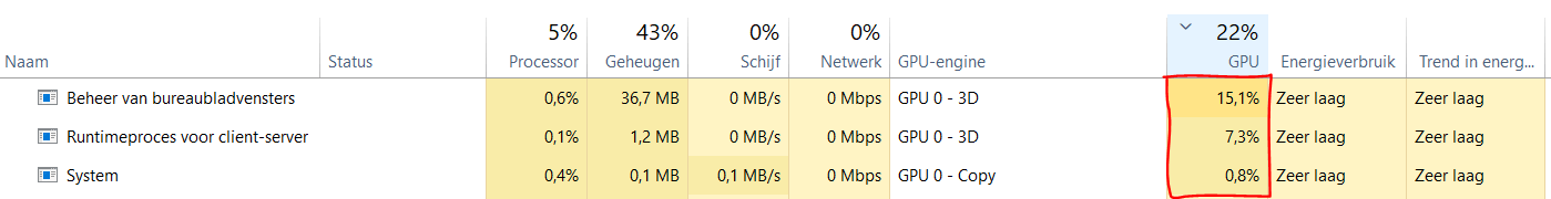 Ik merkte ook dat de apps "Beheer van bureaubladvensters" en "Runtime proces voor client-server" tot 30% GPU gebruiken als ik mijn muis beweeg. Als ik hem stil houd dan zijn gebruiken die apps van 0,1% tot 0,5% GPU. Raar vind ik.