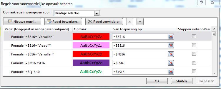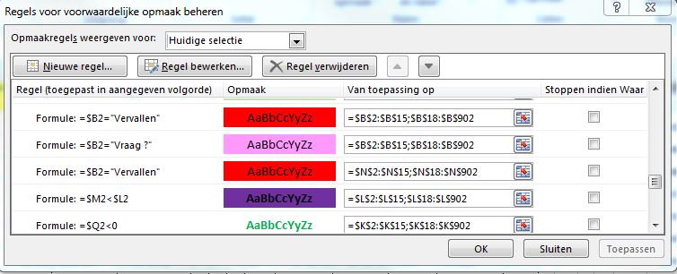 2014-09-22T13:35:30+00:00 Bij het kopiëren wordt standaard de voorwaardelijke opmaak mee gekopieerd. In dit geval is het raadzaam om bij het plakken eerst te kiezen voor "Waarden" of "Formules" waardoor de voorwaardelijke opmaak niet mee gekopieerd wordt. Daarna kan je de regel voor voorwaardelijke opmaak uitbreiden naar de volledige rij/kolom met de oude en de nieuwe waarden. Zo voorkom je dat er teveel regels in de voorwaardelijke opmaak verschijnen.