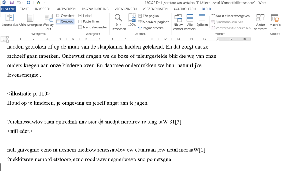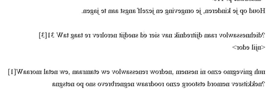 Nog steeds niet overtuigd? Ik heb je schermafbeelding in Word met de optie Draaien / Horizontaal spiegelen bewerkt en het volgens jouw volledig gespiegelde deel hier weer voor je geplaatst. Als het volledig gespiegeld was, zou het nu dus leesbaar moeten zijn. Toch?
