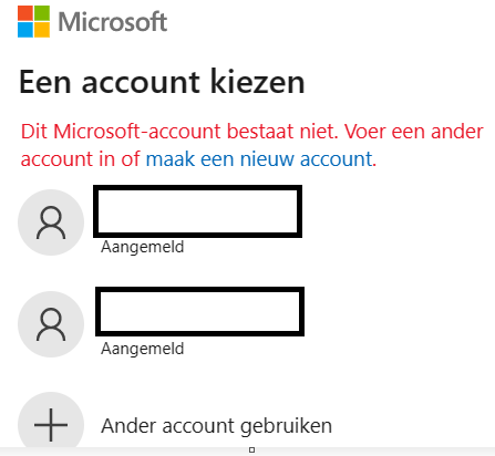 Met een andere browser, of met de In-private browser van Edge, krijg ik dezelfde melding, namelijk dat het account niet bestaat.