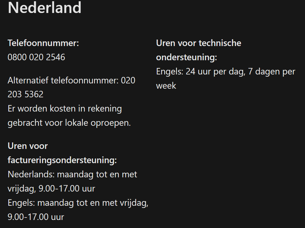 Neem contact op met de ondersteuningsspecialist op het lokale Microsoft 365 Business-telefoonnummer in Nederland dat wordt vermeld in het onderstaande artikel, zoals weergegeven in de afbeelding: