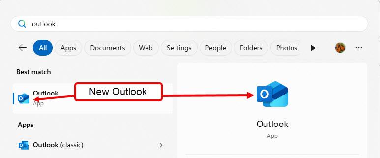 Je kunt beide versies gebruiken. Typ 'Outlook' in het startmenu. Er zouden er twee moeten verschijnen. Als er één niet 'Outlook (klassiek)' heet, moet je de pictogrammen raadplegen. Het pictogram van de nieuwe versie van Outlook is een open envelop met een O erop.