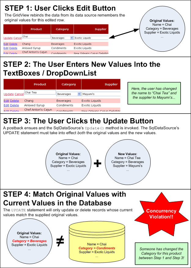 Optimistisch gelijktijdigheidsbeheer werkt door ervoor te zorgen dat de record die wordt bijgewerkt of verwijderd, dezelfde waarden heeft als bij het bijwerken of verwijderen van het proces. Wanneer u bijvoorbeeld op de knop Bewerken in een bewerkbare GridView klikt, worden de waarden van de records gelezen uit de database en weergegeven in tekstvakken en andere webbesturingselementen. Deze oorspronkelijke waarden worden opgeslagen door de GridView. Nadat de gebruiker later wijzigingen heeft aangebracht en op de knop Bijwerken heeft geklikt, moet de UPDATE gebruikte instructie rekening houden met de oorspronkelijke waarden plus de nieuwe waarden en alleen de onderliggende databaserecord bijwerken als de oorspronkelijke waarden die de gebruiker heeft bewerkt, identiek zijn aan de waarden die zich nog in de database bevinden. Afbeelding 3 geeft deze reeks gebeurtenissen weer.