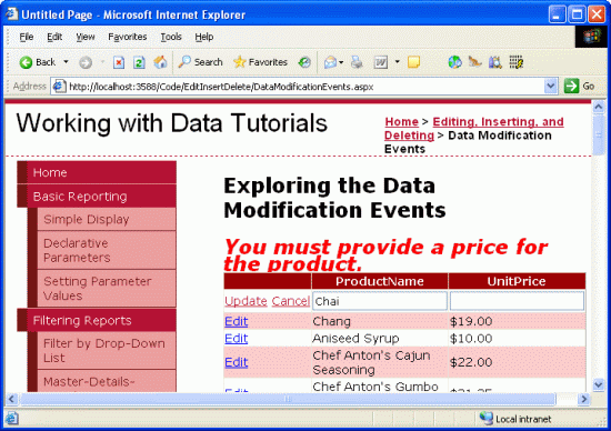 Hoewel de database is geconfigureerd om NULL waarden in de Products kolom van de UnitPrice tabel toe te staan, willen we mogelijk voorkomen dat gebruikers die deze specifieke pagina bezoeken een NULLUnitPrice waarde opgeven. Dat wil zeggen, als een gebruiker bij het bewerken van een productrij geen waarde invoert in UnitPrice, willen we in plaats van de resultaten in de database op te slaan, een bericht tonen dat gebruikers informeert dat op deze pagina bewerkte producten een opgegeven prijs moeten hebben.