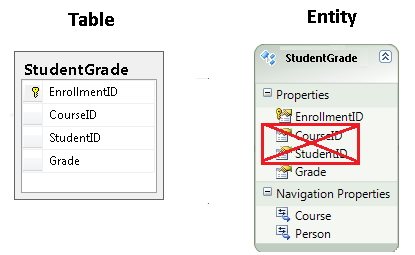 Version 3.5 of the Entity Framework included navigation properties, but it didn't include foreign-key properties in the data model. For example, the CourseID and StudentID columns of the StudentGrade table would be omitted from the StudentGrade entity.