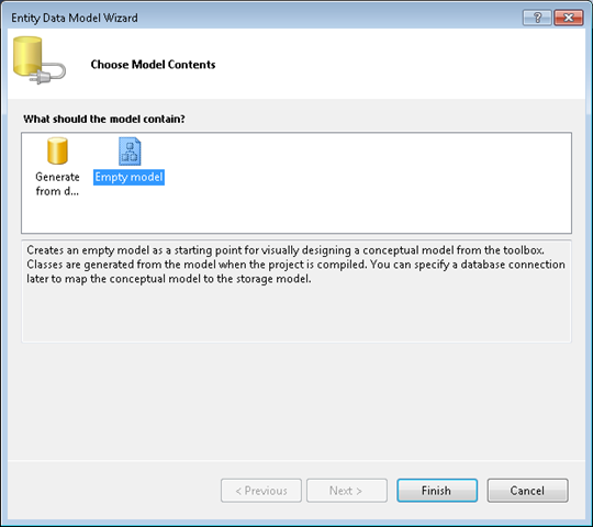 This launches the Entity Data Model Wizard. In the Choose Model Contents step, select Empty Model and then click Finish.