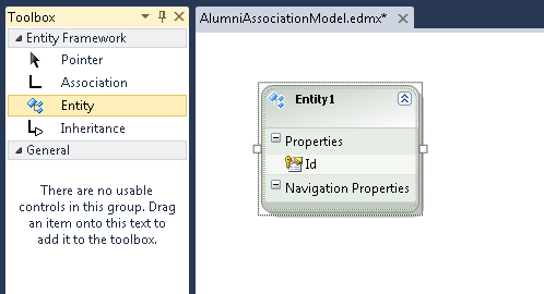 Change the entity name from Entity1 to Alumnus, change the Id property name to AlumnusId, and add a new scalar property named Name. To add new properties you can press Enter after changing the name of the Id column, or right-click the entity and select Add Scalar Property. The default type for new properties is String, which is fine for this simple demonstration, but of course you can change things like data type in the Properties window.