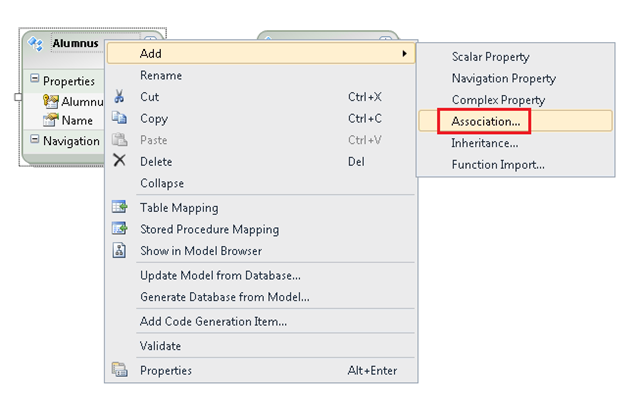 To add an association between these two entities, right-click the Alumnus entity, select Add, and then select Association.