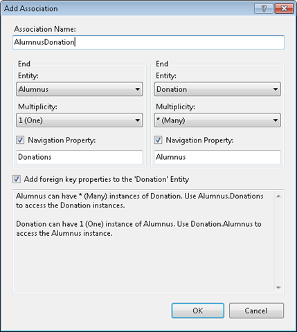 The default values in the Add Association dialog box are what you want (one-to-many, include navigation properties, include foreign keys), so just click OK.