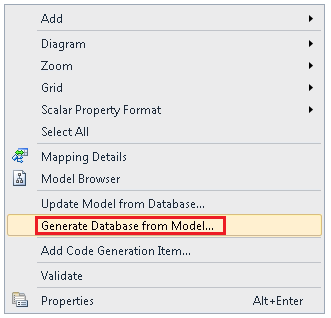 Now you're ready to create the database. Right-click the design surface and select Generate Database from Model.