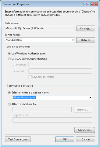 In the Connection Properties dialog box, select the local SQL Server Express instance and name the database AlumniAssociation.