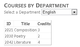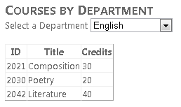 This code executes the SQL Update command using the value in the text box and uses the label to display the number of rows affected. Before you run the page, run the Courses.aspx page to get a "before" picture of some data.