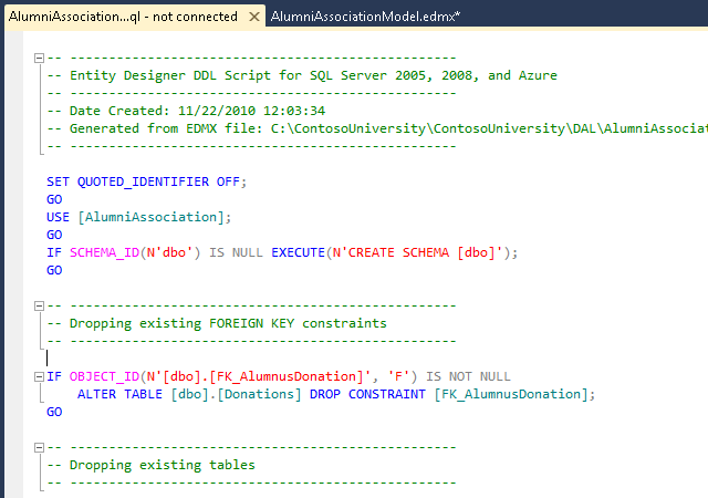 In these walkthroughs you created the database first and then generated the data model based on the database structure. In the Entity Framework 4 you can start with the data model instead and generate the database based on the data model structure. If you're creating an application for which the database doesn't already exist, the model-first approach enables you to create entities and relationships that make sense conceptually for the application, while not worrying about physical implementation details. (This remains true only through the initial stages of development, however. Eventually the database will be created and will have production data in it, and recreating it from the model will no longer be practical; at that point you'll be back to the database-first approach.)