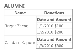 This markup creates nested GridView controls, the outer one to display alumni names and the inner one to display donation dates and amounts.