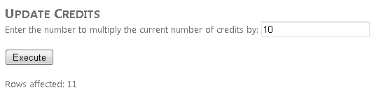 Run UpdateCredits.aspx, enter "10" as the multiplier, and then click Execute.