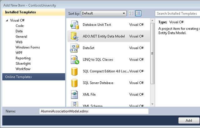 In Solution Explorer, right-click the DAL folder and select Add New Item. In the Add New Item dialog box, under Installed Templates select Data and then select the ADO.NET Entity Data Model template. Name the new file AlumniAssociationModel.edmx and click Add.