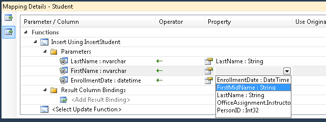 Set the Insert function to InsertStudent. The window shows a list of stored procedure parameters, each of which must be mapped to an entity property. Two of these are mapped automatically because the names are the same. There's no entity property named FirstName, so you must manually select FirstMidName from a drop-down list that shows available entity properties. (This is because you changed the name of the FirstName property to FirstMidName in the first tutorial.)