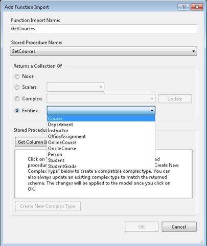 In the Add Function Import dialog box, under Returns a Collection Of select Entities, and then select Course as the entity type returned. When you're done, click OK. Save and close the .edmx file.