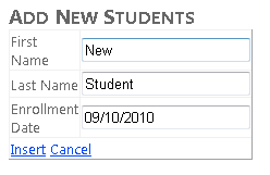 Stored procedures to insert, update, and delete data are used by the Entity Framework automatically after you've added them to the data model and mapped them to the appropriate entities. You can now run the StudentsAdd.aspx page, and every time you create a new student, the Entity Framework will use the InsertStudent stored procedure to add the new row to the Student table.