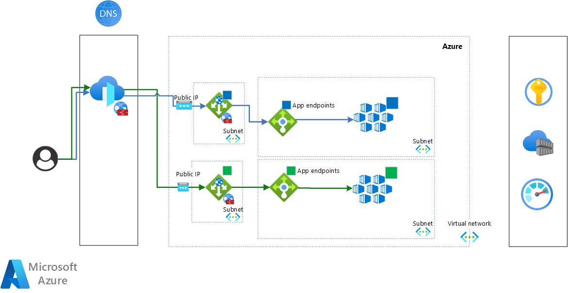 Azure Front Door en Azure DNS bieden het routeringsmechanisme waarmee verkeer tussen de blauwe en groene clusters wordt overgeschakeld. Zie Blauwgroene implementatie met Azure Front Door voor meer informatie. Door Azure Front Door te gebruiken, is het mogelijk om een volledige switch of een meer gecontroleerde switch te implementeren die is gebaseerd op gewichten. Deze techniek is de meest betrouwbare en efficiënte in een Azure-omgeving. Als u uw eigen DNS (Domain Name System) en load balancer wilt gebruiken, moet u ervoor zorgen dat deze zijn geconfigureerd voor een veilige en betrouwbare switch.