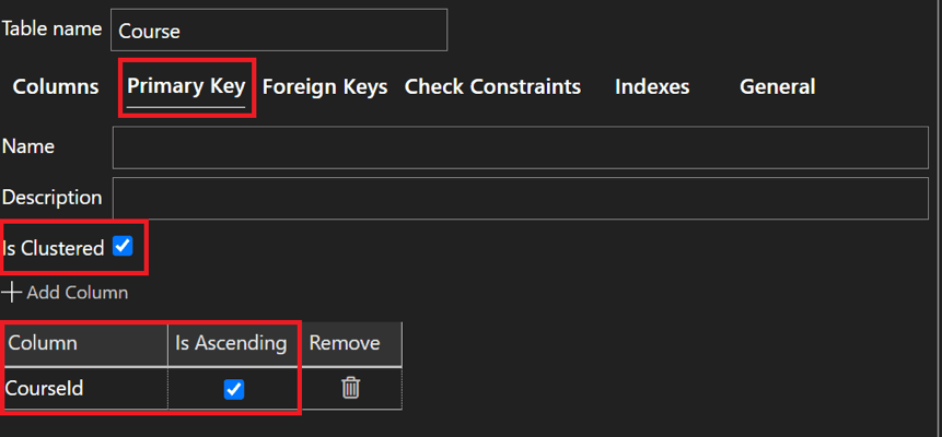 Zorg ervoor dat u de instellingen voor de primaire sleutel voor de cursustabel configureert, zoals hieronder wordt weergegeven:
