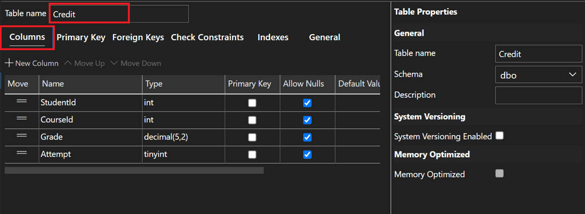 Zorg ervoor dat u de instellingen voor de Check Constraint voor de krediettabel configureert, zoals hieronder wordt weergegeven: