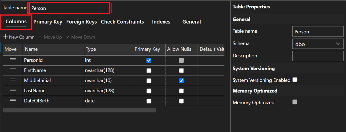 Zorg ervoor dat u de instellingen voor de primaire sleutel voor de persoonstabel configureert, zoals hieronder wordt weergegeven: