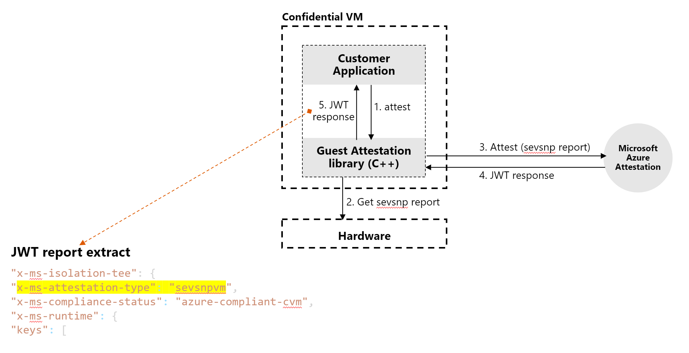 De werklast van de klant moet worden geïntegreerd met de bewijsbibliotheek en uitgevoerd binnen de vertrouwelijke VM. Nadat de workload van de klant een aanvraag naar de attestation-bibliotheek heeft ingevoerd, analyseert de workload van de klant het antwoord om te bepalen of de virtuele machine wordt uitgevoerd op het juiste hardwareplatform en/of beveiligde opstartinstelling voordat de gevoelige workload volledig wordt ingesteld.