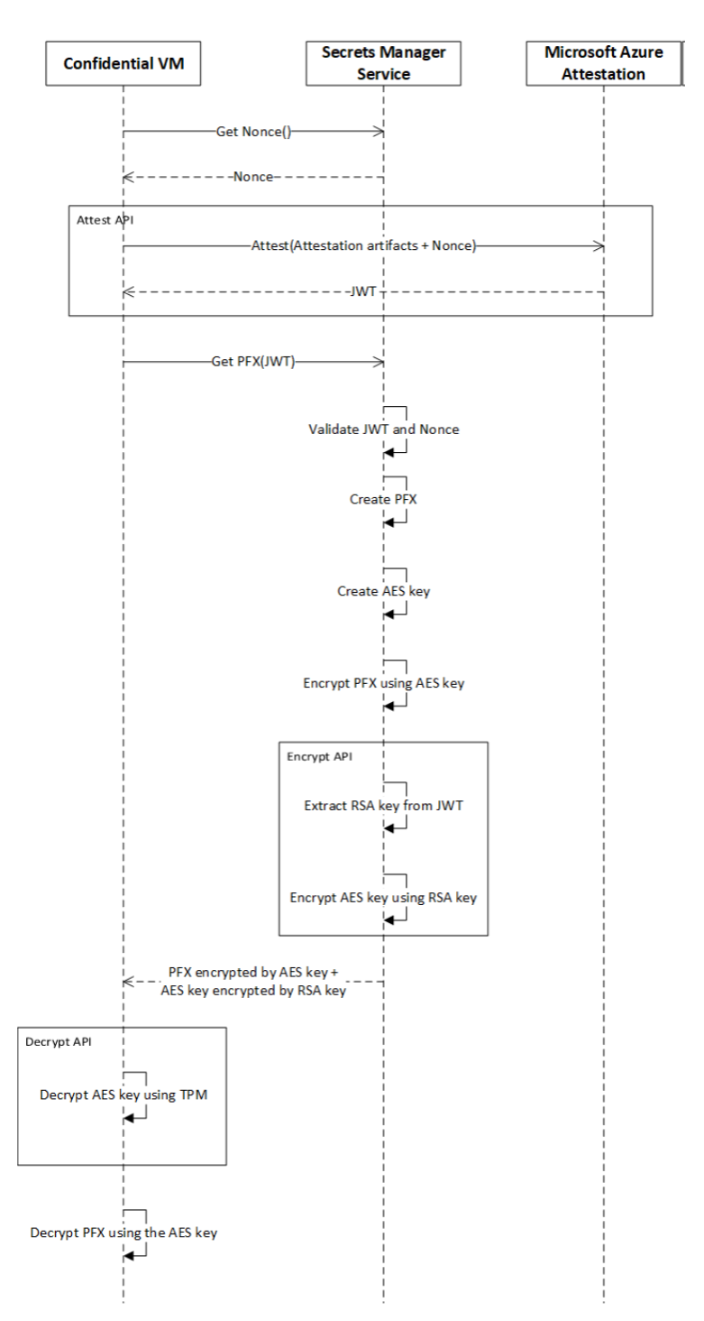 In het volgende sequentiediagram wordt het relying party-scenario verder uitgelegd. De aanvraag/reactie tussen de betrokken systemen maakt gebruik van de API's van de gastattestbibliotheek. De vertrouwelijke VM communiceert met de geheimenbeheerder om zichzelf op te starten met behulp van de ontvangen geheimen.