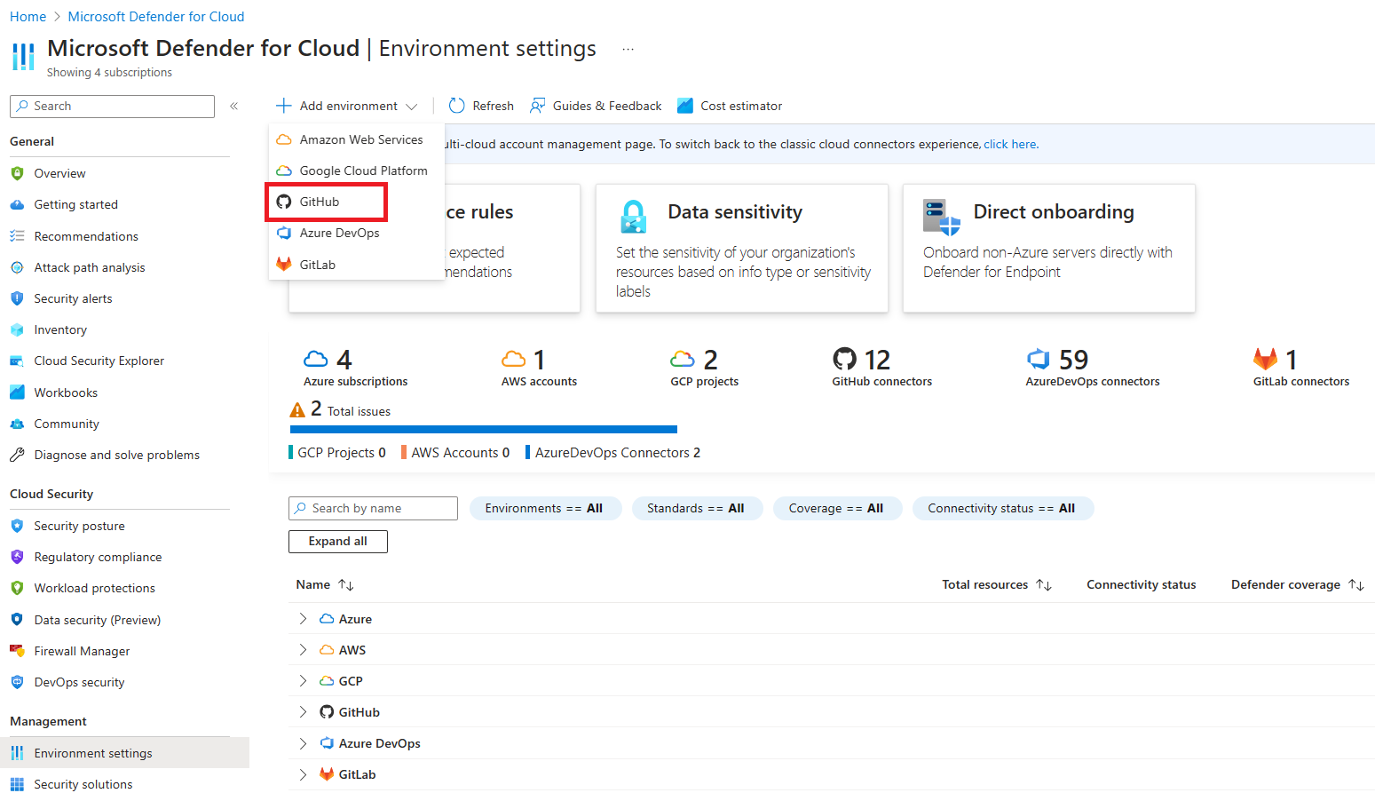 In deze quickstart verbindt u uw GitHub-organisaties op de pagina Omgevingsinstellingen in Microsoft Defender voor Cloud. Deze pagina biedt een eenvoudige onboarding-ervaring voor het automatisch opsporen van uw GitHub-opslagplaatsen.
