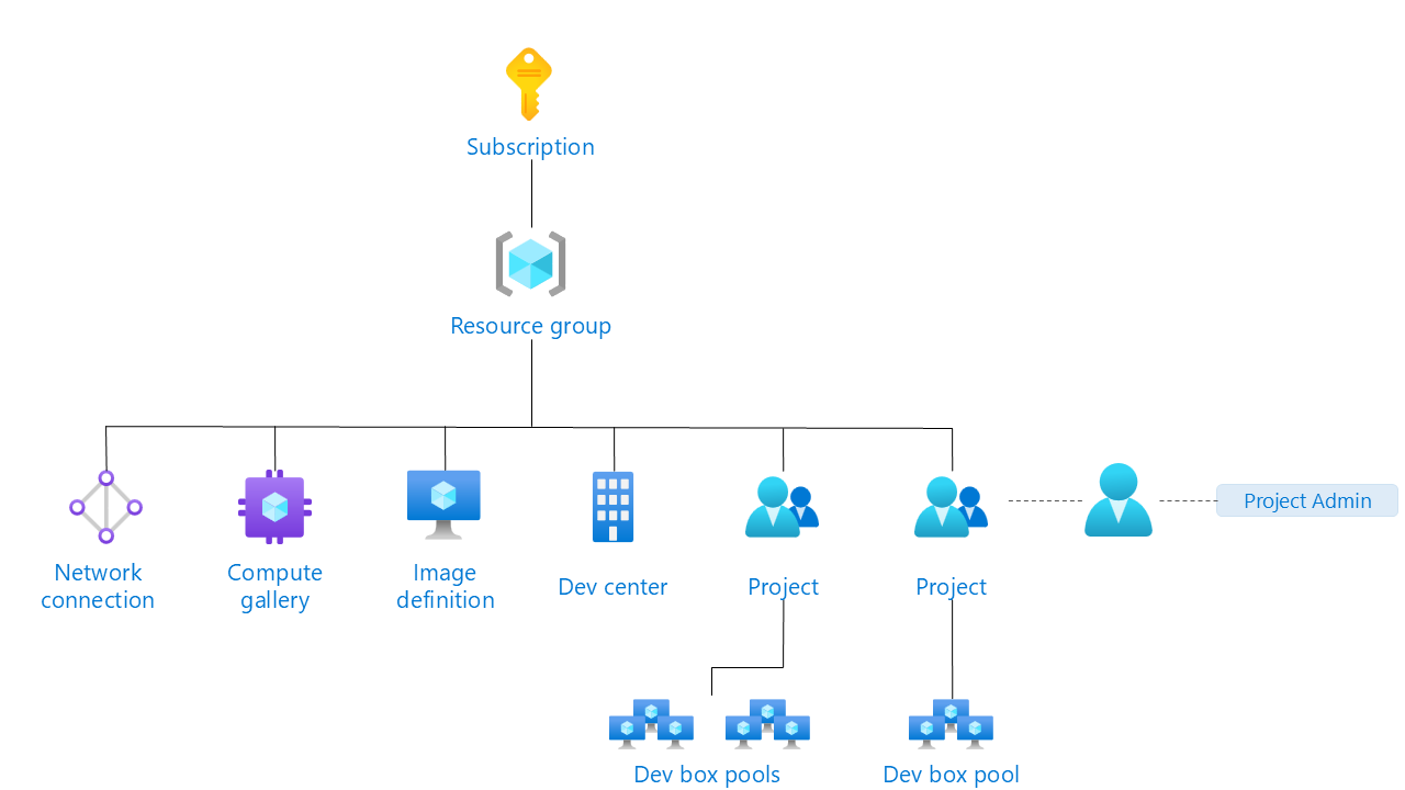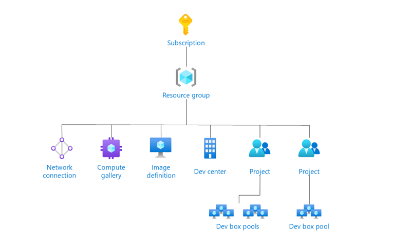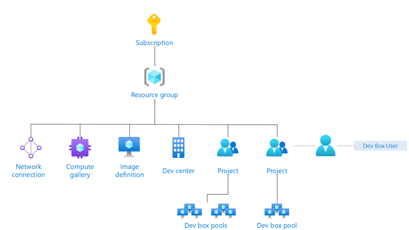 Resourcegroep Een logische container voor het groeperen van resources. Roltoewijzing voor de resourcegroep verleent machtigingen aan de resourcegroep en alle resources daarin, zoals dev centers, dev box-definities, dev box-pools, projecten en dev-vakken.