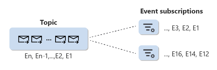Gebeurtenissen die naar Event Grid worden gepubliceerd, komen terecht op een onderwerp. Dit is een resource die alle gebeurtenissen logisch bevat. Een gebeurtenisabonnement is een configuratieresource die is gekoppeld aan één onderwerp. U gebruikt onder andere een gebeurtenisabonnement om selectiecriteria voor gebeurtenissen in te stellen om de gebeurtenisverzameling te definiëren die beschikbaar is voor een abonnee uit de totale set gebeurtenissen die aanwezig zijn in een onderwerp.