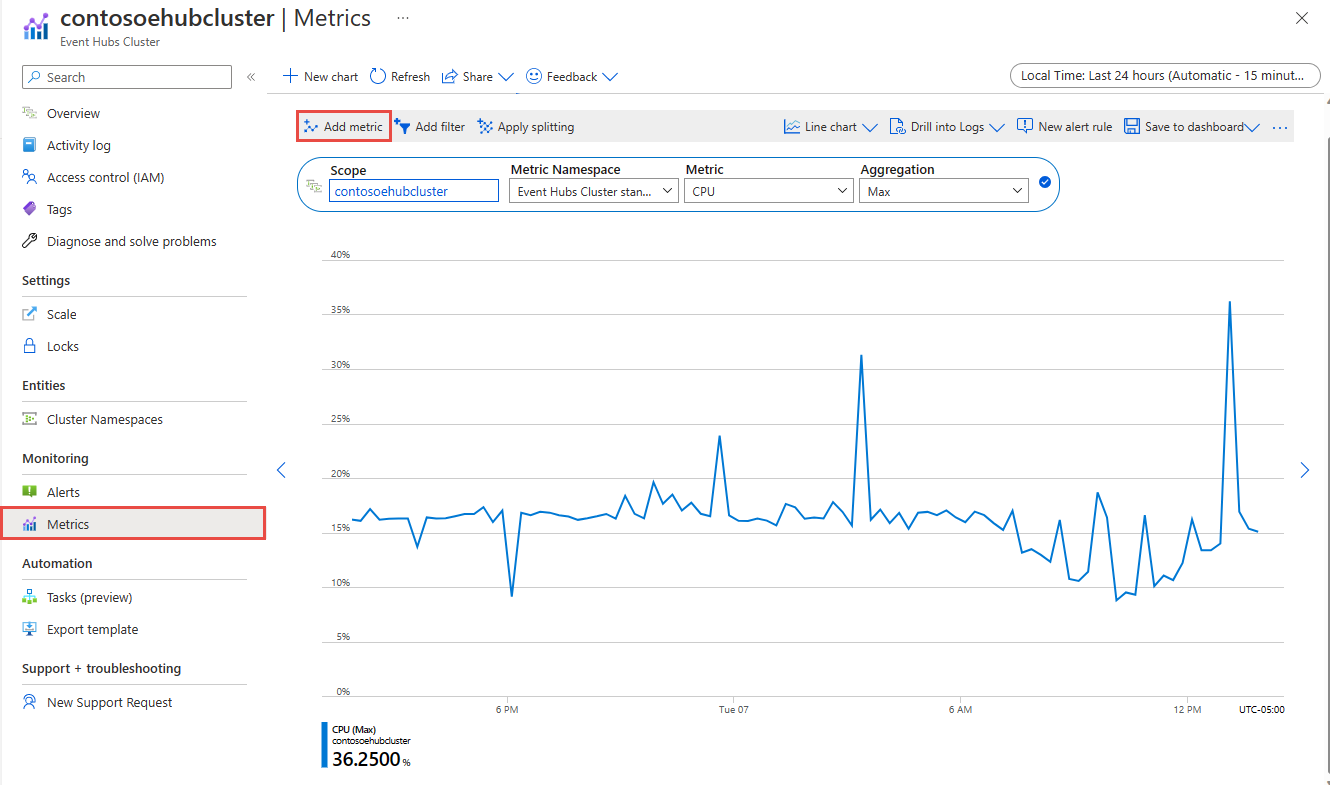 Selecteer Op de pagina Metrische gegevens van uw toegewezen Event Hubs-cluster de optie Metrische gegevens toevoegen.