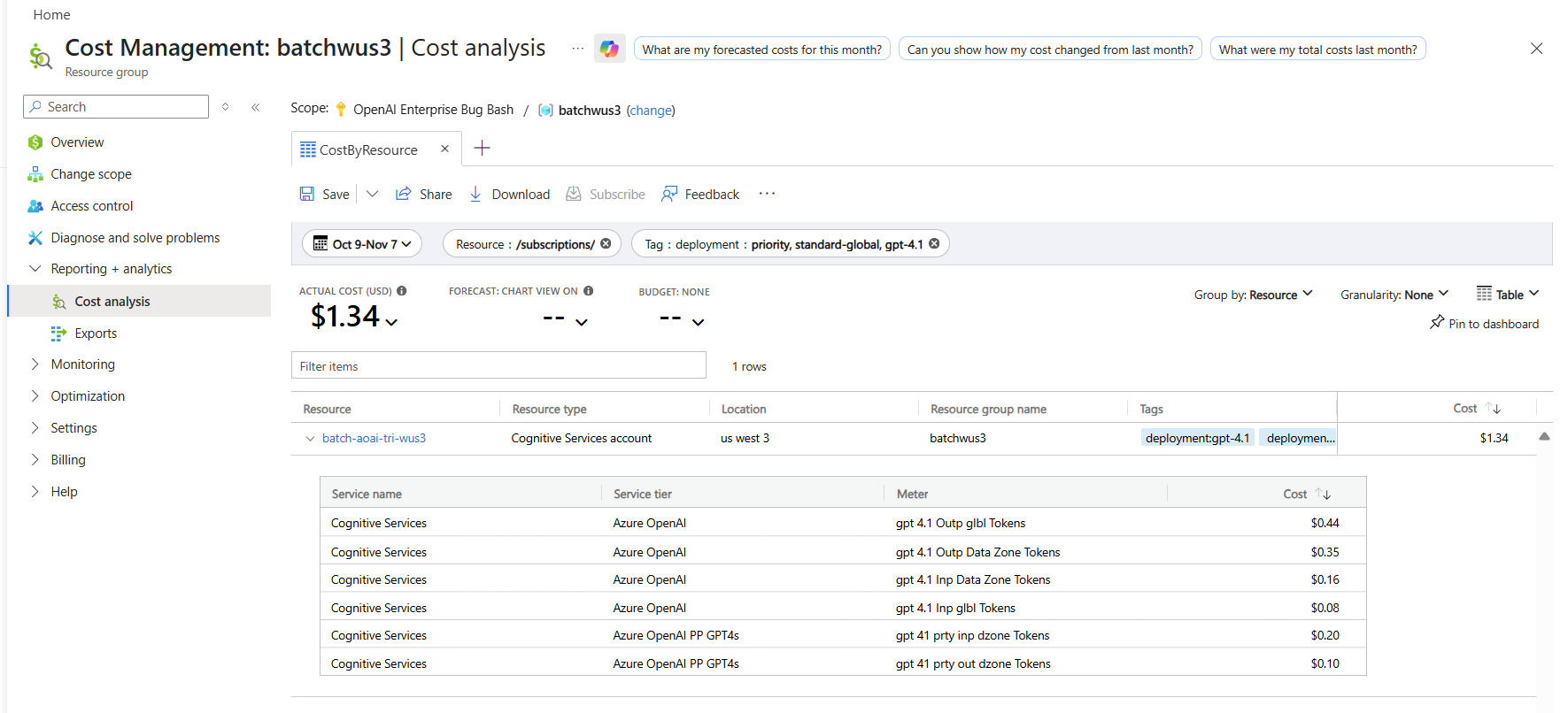 U ziet een uitsplitsing van de kosten voor prioriteits- en standaardaanvragen op de pagina kostenanalyse van Azure Portal door als volgt te filteren op de implementatienaam en factureringstags: