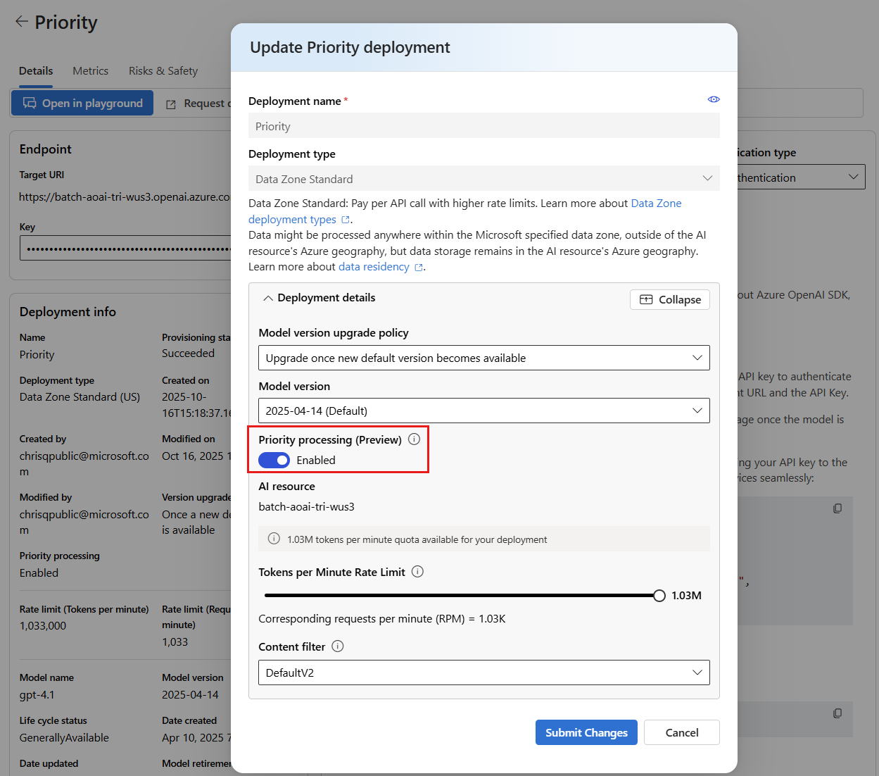 In de Microsoft Foundry-portal kunt u prioriteitsverwerking inschakelen tijdens het instellen van de implementatie. Schakel de wisselknop Prioriteitsverwerking (preview) in op de pagina met implementatiedetails wanneer u de implementatie maakt of de instelling bijwerkt door de implementatiedetails van een geïmplementeerd model te bewerken.