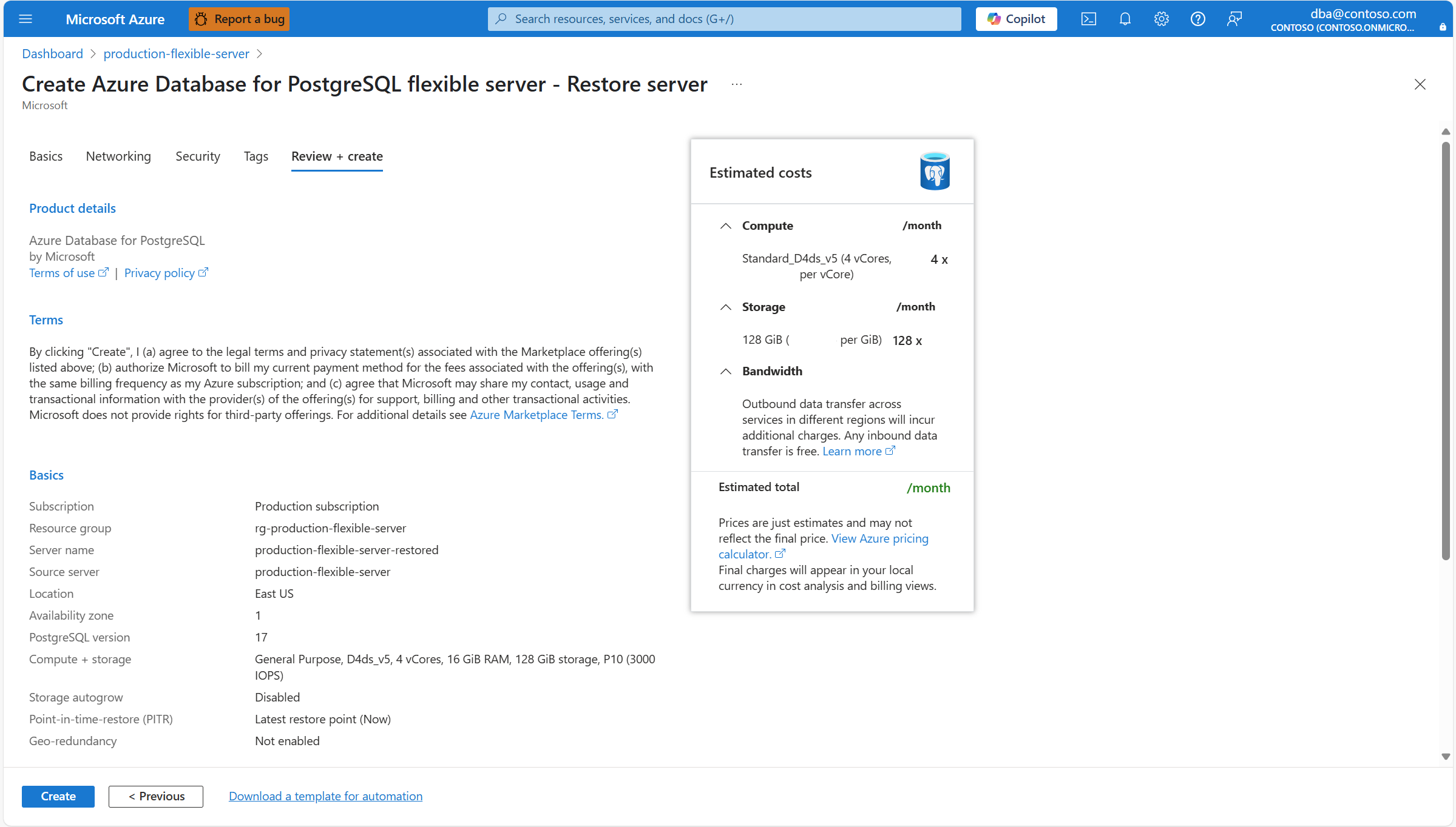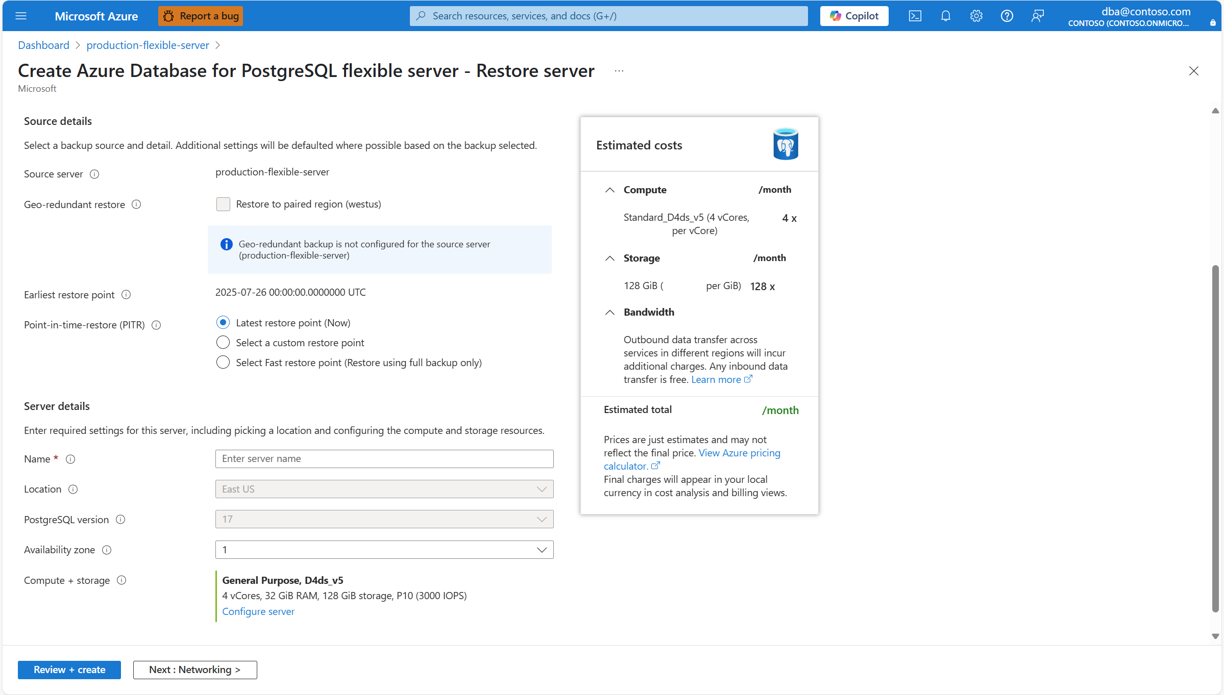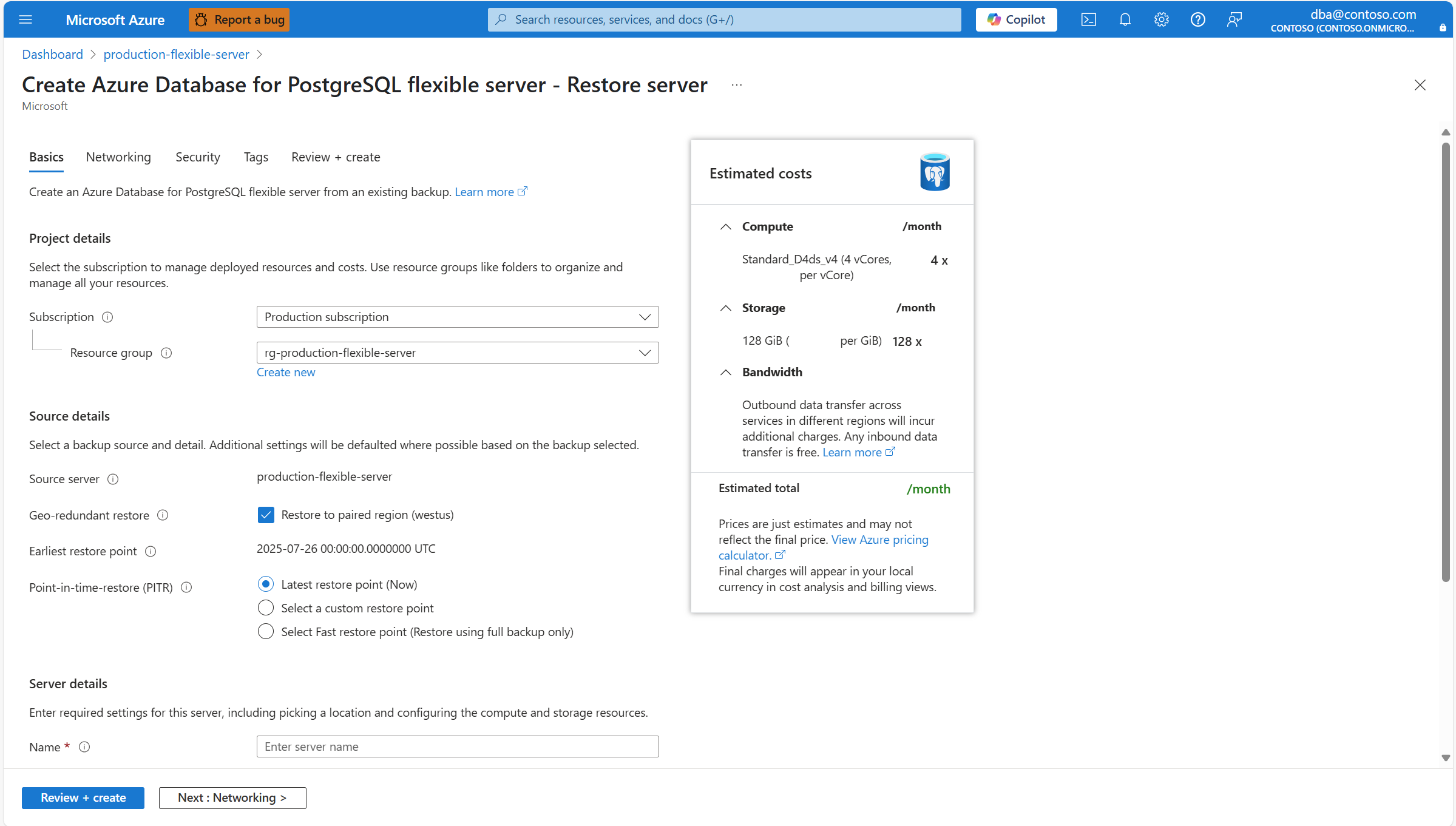 U wordt omgeleid naar de Azure Database voor PostgreSQL flexibele server maken - Server herstellen wizard, waar u bepaalde instellingen kunt configureren voor de nieuwe server die wordt gemaakt. Nadat de nieuwe server is geïmplementeerd, wordt de meest recente momentopname van de gegevensschijf van de bronserver hersteld. Selecteer in de sectie Geografisch redundant herstel de optie Herstellen naar gekoppelde regio (<paired_region>).