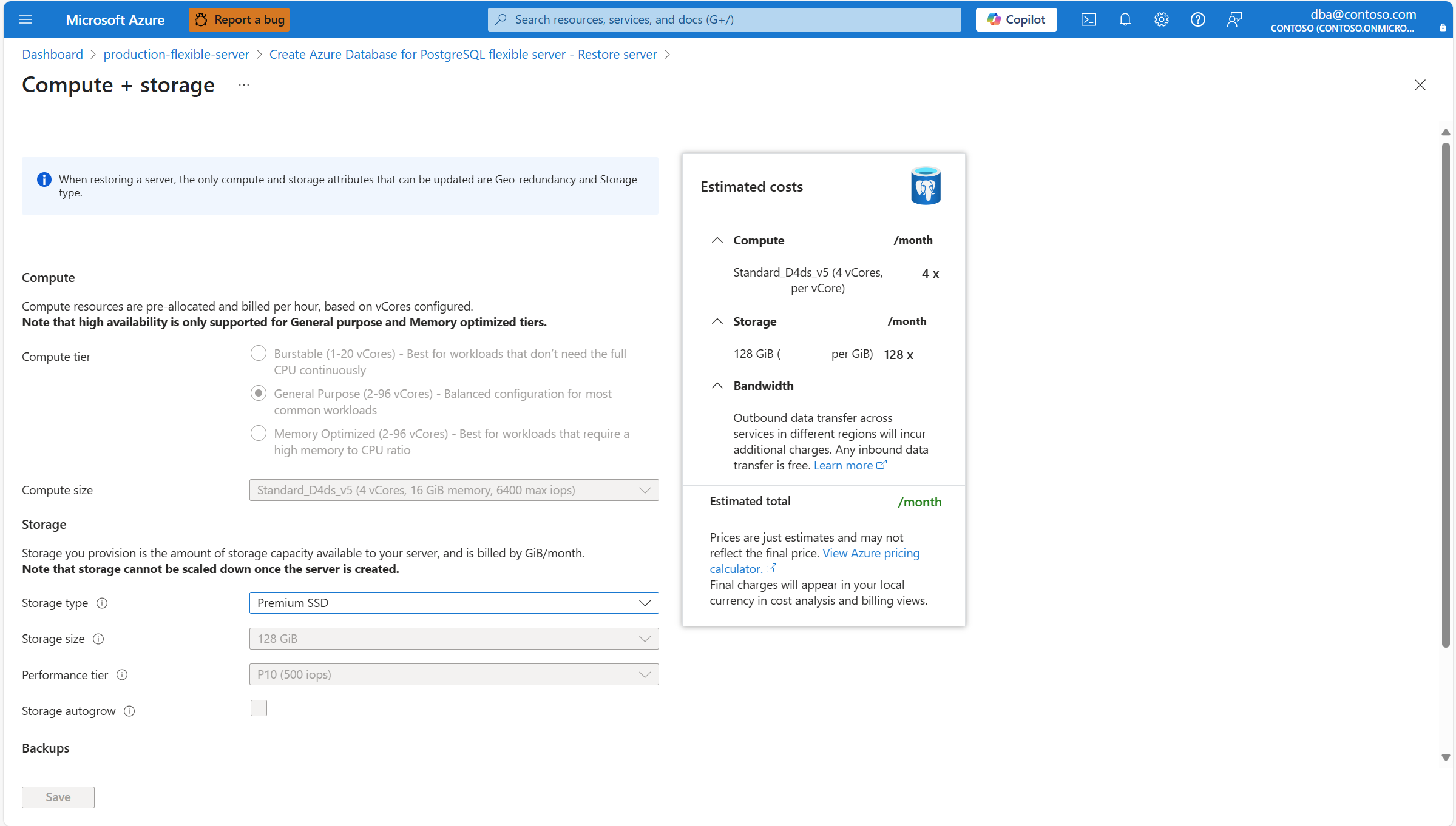 Afdeling Configuratie Voorgestelde waarde Description Kan worden gewijzigd na aanmaak van de instantie Berekenen Rekenlaag Kan niet worden gewijzigd en wordt automatisch ingesteld op dezelfde waarde als de bronserver. Mogelijke waarden zijn Burstable (meestal gebruikt voor ontwikkelomgevingen waarin workloads niet de volledige capaciteit van de CPU continu nodig hebben) en Algemeen gebruik (meestal gebruikt voor productieomgevingen met de meest voorkomende workloads) en Geoptimaliseerd voor geheugen (meestal gebruikt voor productieomgevingen waarop workloads worden uitgevoerd waarvoor een hoge geheugen-cpu-verhouding is vereist). Zie Compute-opties in Azure Database for PostgreSQL Flexibele server voor meer informatie. Kan worden aangepast nadat de server is aangemaakt. Als u echter bepaalde functionaliteit gebruikt die alleen wordt ondersteund op bepaalde lagen en de huidige laag wijzigt in een laag waarin de functie niet wordt ondersteund, wordt de functie niet meer beschikbaar of wordt uitgeschakeld. Rekenkracht Kan niet worden gewijzigd en wordt automatisch ingesteld op dezelfde waarde als de bronserver. De lijst met ondersteunde waarden kan per regio variëren, afhankelijk van de hardware die beschikbaar is voor elke regio. Zie Compute-opties in Azure Database for PostgreSQL Flexibele server voor meer informatie. Kan worden gewijzigd nadat de instantie is aangemaakt. Opslag Opslagtype Selecteer Premium SSD. De lijst met toegestane waarden kan variëren, afhankelijk van welke andere functies u hebt geselecteerd. Zie Opslagopties in flexibele Azure Database for PostgreSQL-server voor meer informatie. Kan niet worden gewijzigd nadat de instantie is gemaakt. Opslaggrootte Kan niet worden gewijzigd en wordt automatisch ingesteld op dezelfde waarde als de bronserver. De lijst met ondersteunde waarden kan per regio variëren, afhankelijk van de hardware die beschikbaar is voor elke regio. Zie Compute-opties in Azure Database for PostgreSQL Flexibele server voor meer informatie. Kan worden gewijzigd nadat de instantie is gemaakt. Het kan alleen worden verhoogd. Handmatig of automatisch verkleinen van opslag wordt niet ondersteund. Acceptabele waarden zijn afhankelijk van het type opslag dat aan het exemplaar is toegewezen. Prestatielaag Kan niet worden gewijzigd en wordt automatisch ingesteld op dezelfde waarde als de bronserver. De prestaties van Ssd-schijven (Solid-State Drives) van Premium worden ingesteld wanneer u de schijf maakt, in de vorm van hun prestatielaag. Wanneer u de ingerichte grootte van de schijf instelt, wordt automatisch een prestatielaag geselecteerd. Deze prestatielaag bepaalt de IOPS en doorvoer van uw beheerde schijf. Voor Premium SSD-schijven kan deze laag worden gewijzigd tijdens de implementatie of later, zonder de grootte van de schijf te wijzigen en zonder uitvaltijd. Als u de laag wijzigt, kunt u zich voorbereiden op en voldoen aan een hogere vraag zonder de burst-mogelijkheid van uw schijf te gebruiken. Het kan kosteneffectiever zijn om uw prestatieklasse te wijzigen in plaats van een beroep te doen op tijdelijke capaciteitsuitbreiding, afhankelijk van de duur van de benodigde extra prestaties. Dit is ideaal voor gebeurtenissen die tijdelijk een consistent hoger prestatieniveau vereisen. Activiteiten zoals feestdagenshoppen, prestatietests uitvoeren, of het runnen van een trainingsomgeving. Als u deze gebeurtenissen wilt afhandelen, kunt u een schijf overschakelen naar een hogere prestatielaag zonder uitvaltijd, zolang u de extra prestaties nodig hebt. U kunt vervolgens zonder downtime terugkeren naar de oorspronkelijke laag wanneer de extra prestaties niet meer nodig zijn. Kan worden gewijzigd nadat de instantie is gemaakt. Opslag automatisch uitbreiden Kan niet worden gewijzigd en wordt automatisch ingesteld op dezelfde waarde als de bronserver. Deze optie wordt mogelijk niet ondersteund voor sommige opslagtypen en wordt mogelijk niet gehonoreerd voor bepaalde opslaggrootten. Zie Automatische groei van opslag configureren in een flexibele Azure Database for PostgreSQL-server voor meer informatie. Kan worden gewijzigd nadat het exemplaar is gemaakt, zolang het opslagtype deze functie ondersteunt. Backups Bewaarperiode voor back-ups (in dagen) Kan niet worden gewijzigd en wordt automatisch ingesteld op dezelfde waarde als de bronserver. De standaardretentieperiode voor back-ups is 7 dagen, maar u kunt de periode verlengen tot maximaal 35 dagen. Kan worden gewijzigd nadat de instantie is aangemaakt. Back-up-redundantie Automatisch voor u geselecteerd, op basis van de configuratie van hoge beschikbaarheid en georedundantie van back-ups. Mogelijke waarden zijn lokaal redundant (biedt ten minste 99,9999999999% duurzaamheid van back-upobjecten gedurende een jaar), zone-redundant (biedt ten minste 99,9999999999% duurzaamheid van back-upobjecten gedurende een jaar) en Geografisch redundant (biedt ten minste 99,9999999999999% duurzaamheid van back-upobjecten gedurende een jaar). Wanneer georedundantie is ingeschakeld voor de back-up, wordt de optie voor back-upredundantie ingesteld op Geografisch redundant. Als hoge beschikbaarheid is ingesteld op Uitgeschakeld of Dezelfde zone, wordt back-up redundantie ingesteld op Lokaal redundant. En als hoge beschikbaarheid is ingesteld op Zone redundant, wordt back-up redundantie ingesteld op Zone redundant. Voor meer informatie, zie opties voor back-upredundantie in Azure Database for PostgreSQL flexibele server. Kan niet worden gewijzigd nadat de instantie is aangemaakt. Georedundantie Laat deze optie uitgeschakeld. Georedundantie in back-ups wordt alleen ondersteund voor exemplaren die zijn geïmplementeerd in een van de gekoppelde Azure-regio's. Bekijk voor meer informatie Geografisch redundante back-up en herstel in Azure Database for PostgreSQL flexibele server Kan niet worden gewijzigd nadat de instantie is aangemaakt. Zodra alle nieuwe server is geconfigureerd voor uw behoeften, selecteert u Beoordelen en maken.