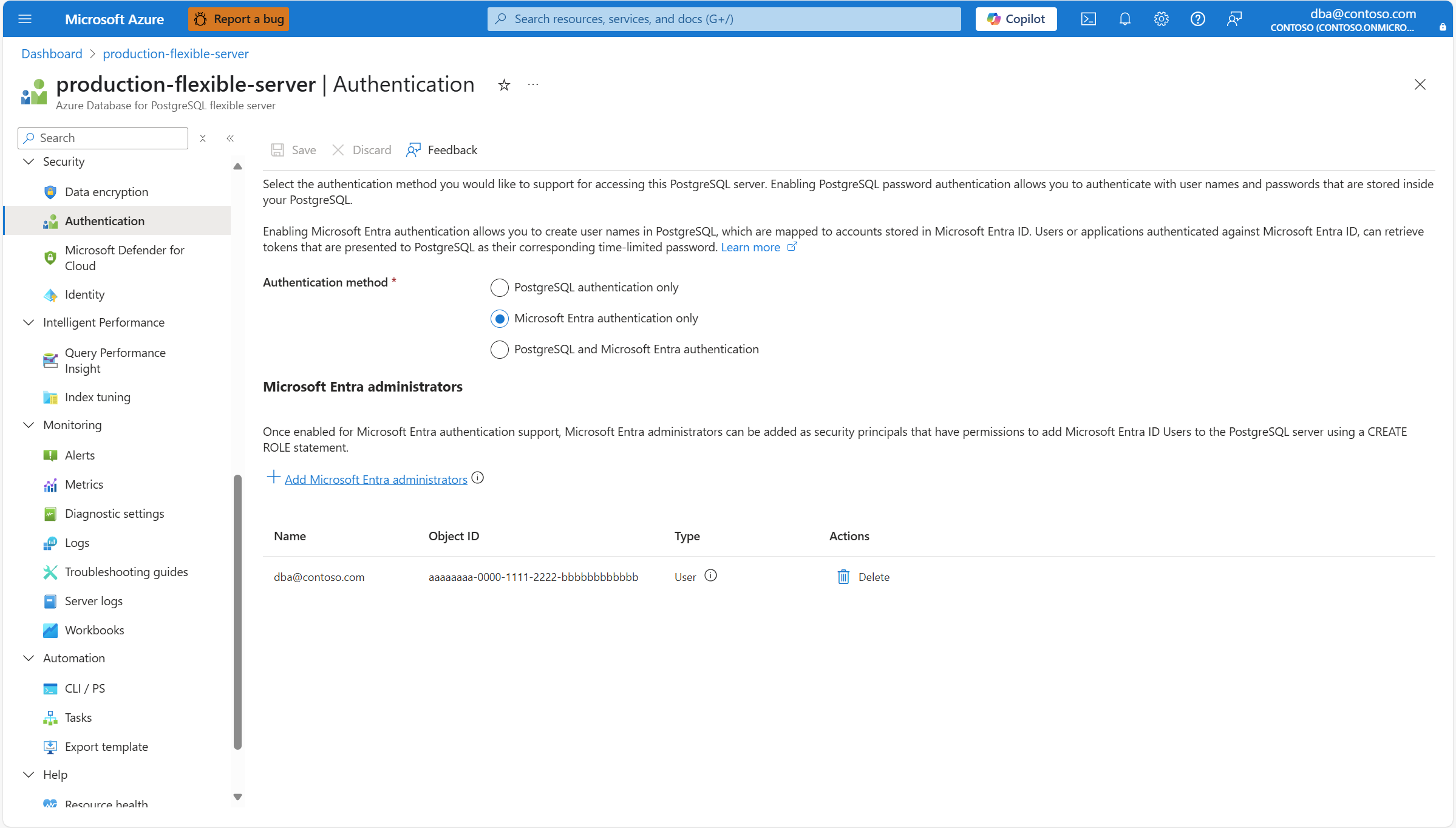Schermopname die laat zien dat de verificatie van de server alleen is geconfigureerd met Microsoft Entra-verificatie.