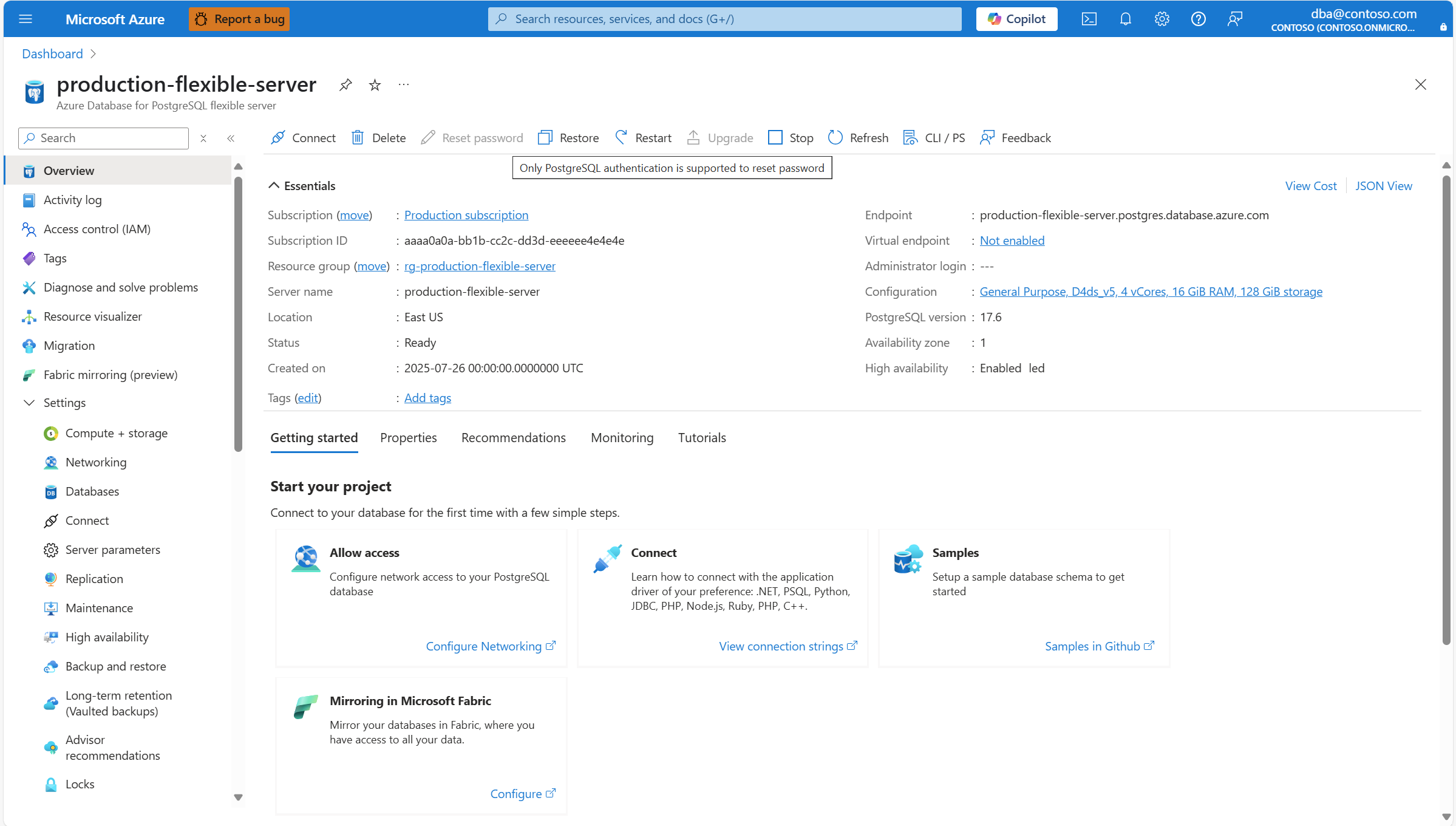 5. De verificatiemethode moet alleen PostgreSQL-verificatie of PostgreSQL- en Microsoft Entra-verificatie zijn om de knop Wachtwoord opnieuw instellen in te schakelen op de werkbalk. Als deze is ingesteld op Alleen Microsoft Entra-verificatie, wordt de knop Wachtwoord opnieuw instellen uitgeschakeld.