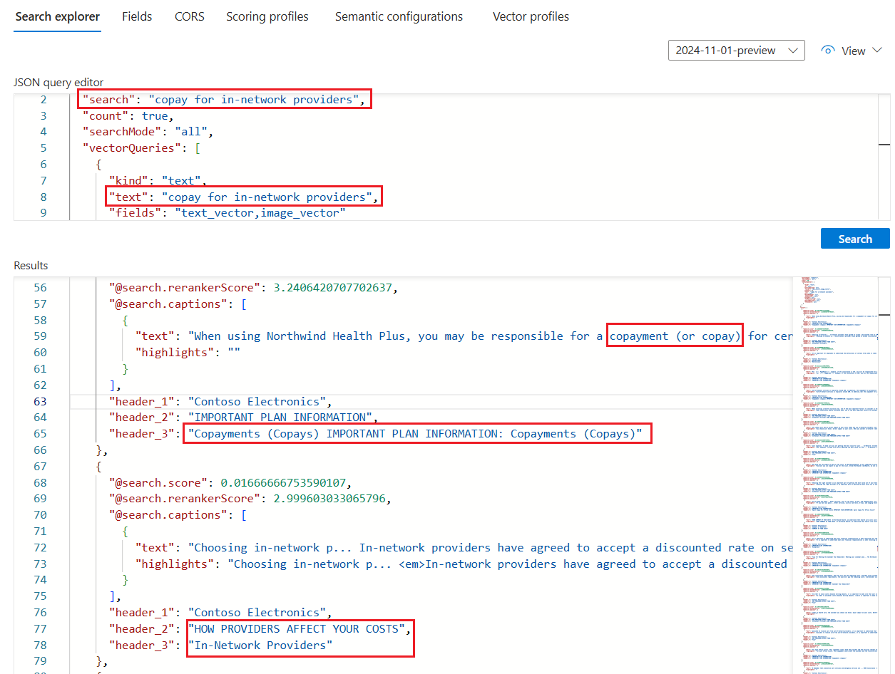 Als u de resultaten wilt controleren, voert u een query uit op de index. Gebruik Search Explorer als zoekclient of een hulpprogramma waarmee HTTP-aanvragen worden verzonden. Met de volgende query worden velden geselecteerd die de uitvoer bevatten van de niet-vectorinhoud van een markdown-sectie en de bijbehorende vector.
