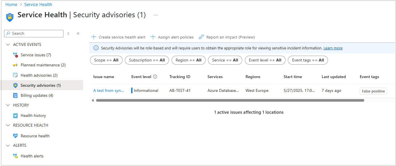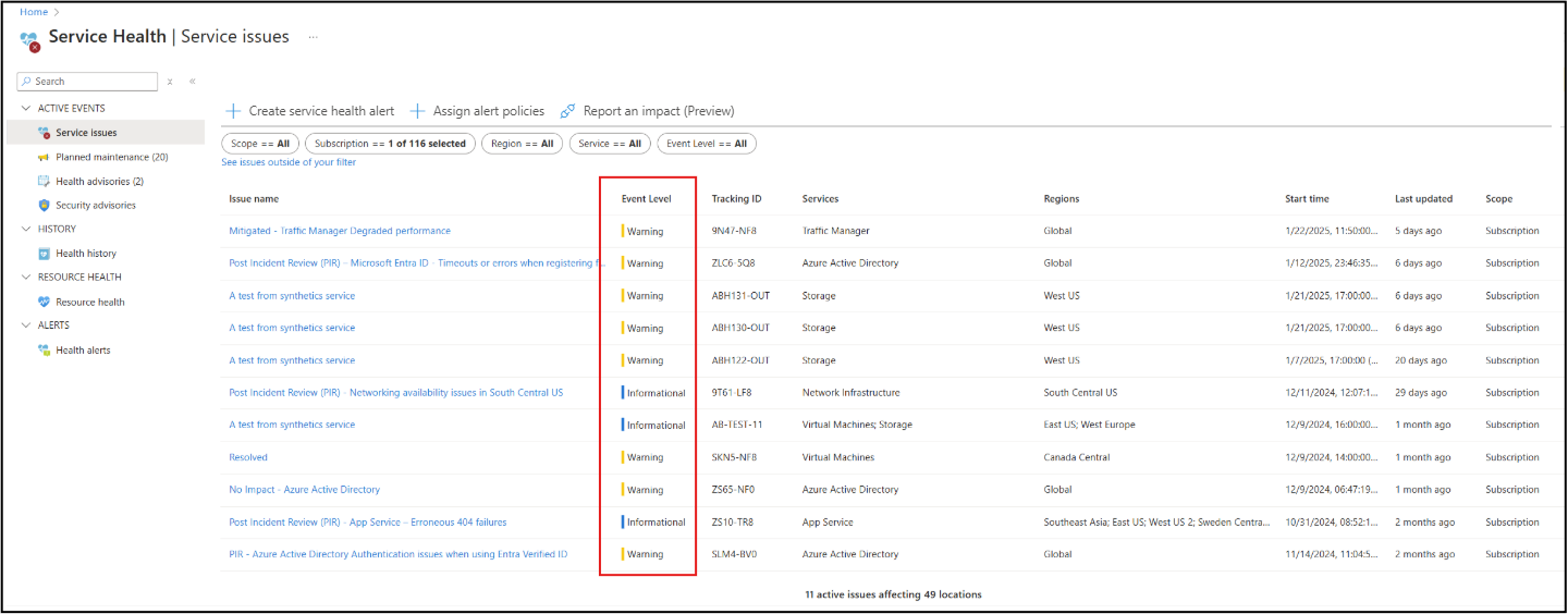 Voor hulp bij het prioriteren van communicatie met Azure Service Health-gebeurtenissen bevatten de deelvensters Serviceproblemen,Statusadviezen en Beveiligingsadviezen een nieuw metagegevensveld met de naam Gebeurtenisniveau. Dit veld kan u helpen de betekenis van elke communicatie te begrijpen en snel het belang van elke waarschuwing te evalueren.