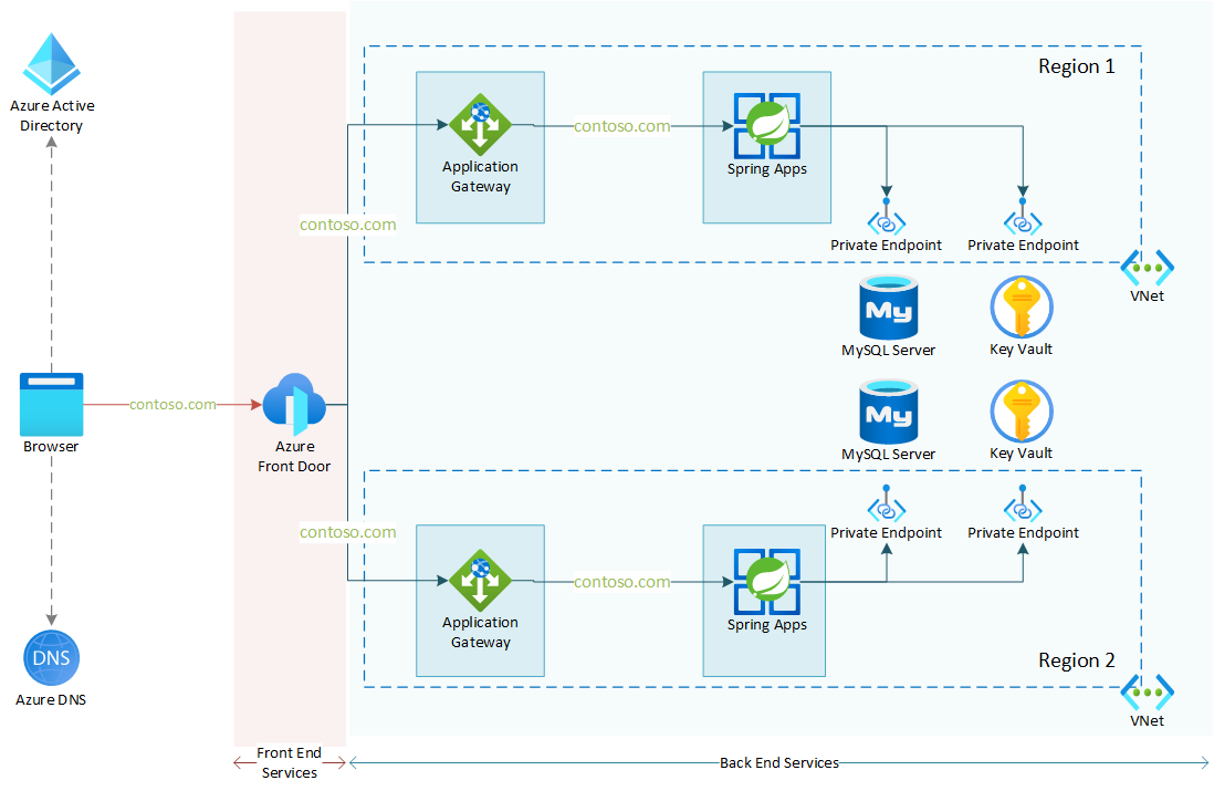 In het volgende diagram ziet u de architectuur van een multi-region redundante, in virtuele netwerken geïntegreerde Azure Spring Apps-service-instantie. In het diagram ziet u de juiste reverse proxy-configuratie voor Application Gateway en Front Door met een aangepast domein. Deze architectuur is gebaseerd op het scenario dat wordt beschreven in Toepassingen beschikbaar maken met end-to-end TLS in een virtueel netwerk. Deze benadering combineert twee met Application Gateway geïntegreerde azure Spring Apps virtual-network-injection-exemplaren in een geografisch redundant exemplaar.