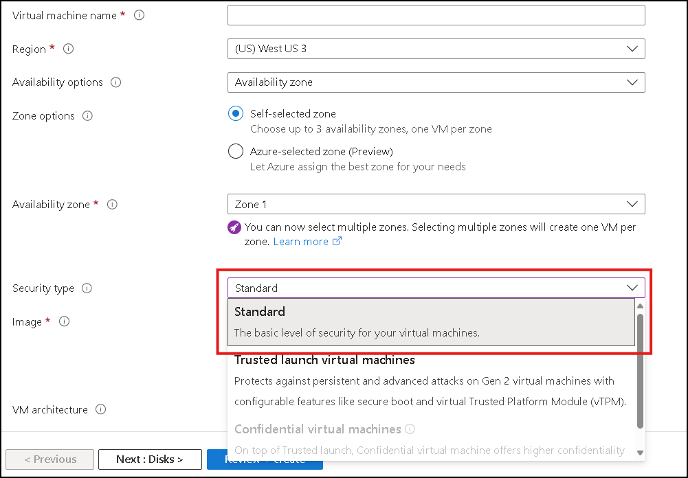 Nadat u een abonnement op preview hebt geregistreerd, wordt de VM of schaalset Standardgeïmplementeerd wanneer u het beveiligingstype Trusted launch instelt in Azure Portal. Deze beperking wordt opgelost vóór de algemene beschikbaarheid van de standaardfunctie Trusted Launch.