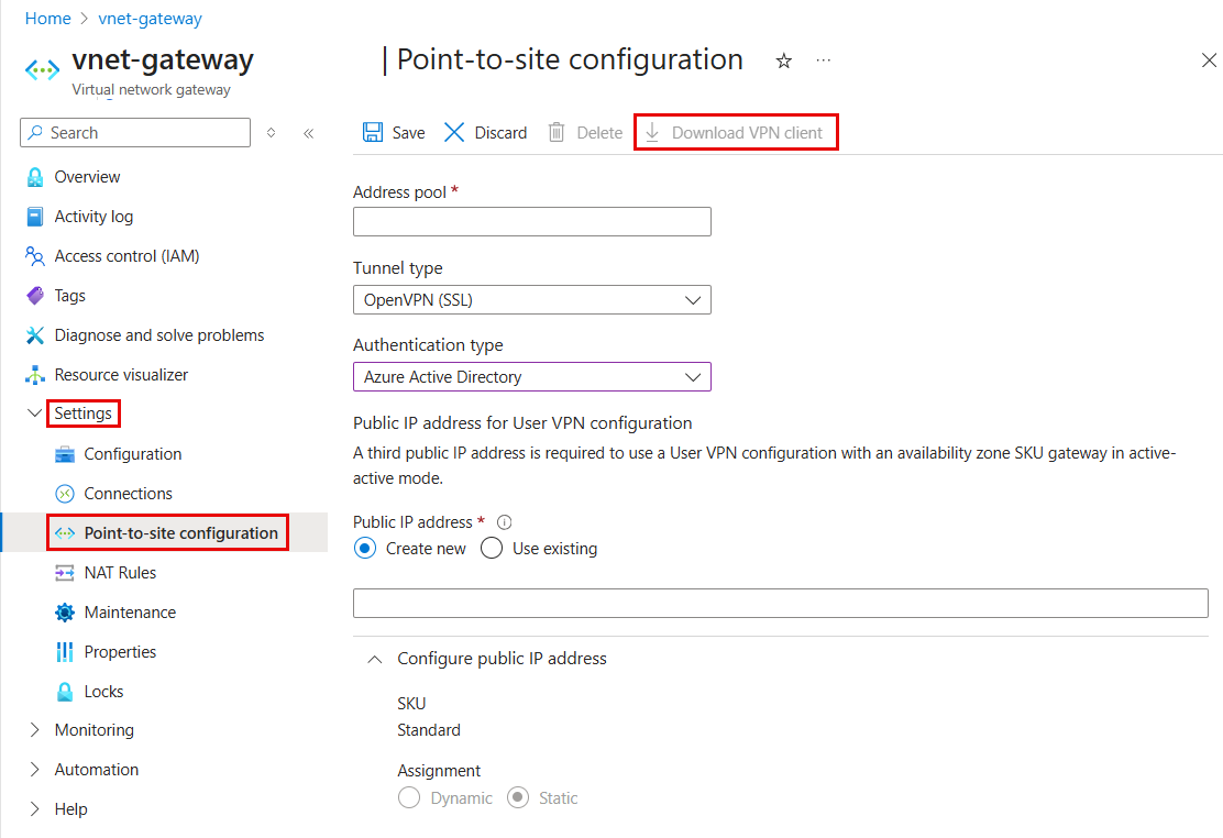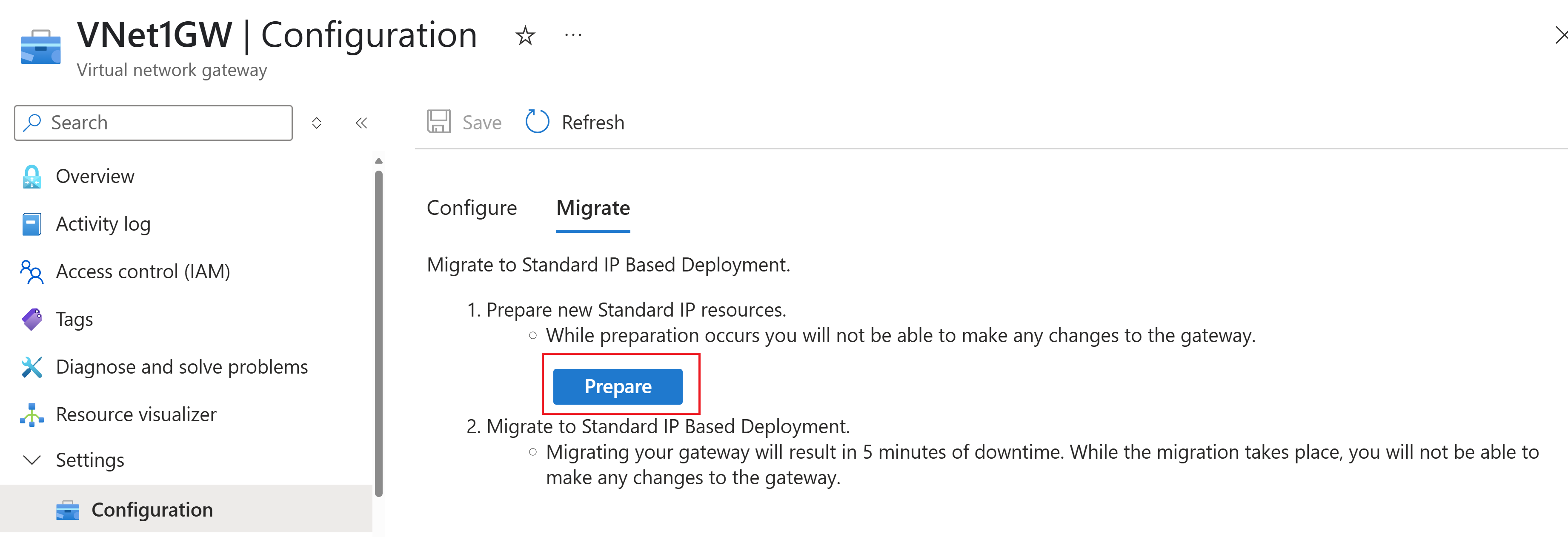 Ga in Azure Portal naar de gatewayresource van uw virtuele netwerk. Klik in het linkerdeelvenster onder Instellingen op Configuratie.