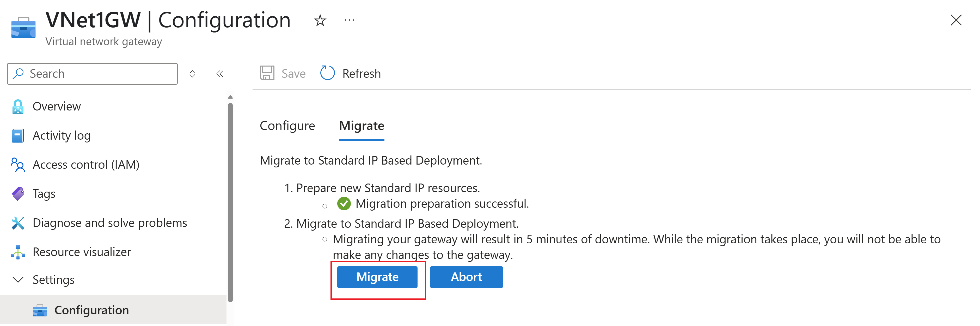 Klik op de knop Migreren om uw openbare IP-adres-SKU en uw gateway-SKU te migreren. Gedurende deze tijd hebt u 5 minuten downtime en kunt u geen wijzigingen aanbrengen in uw VPN-gateway.