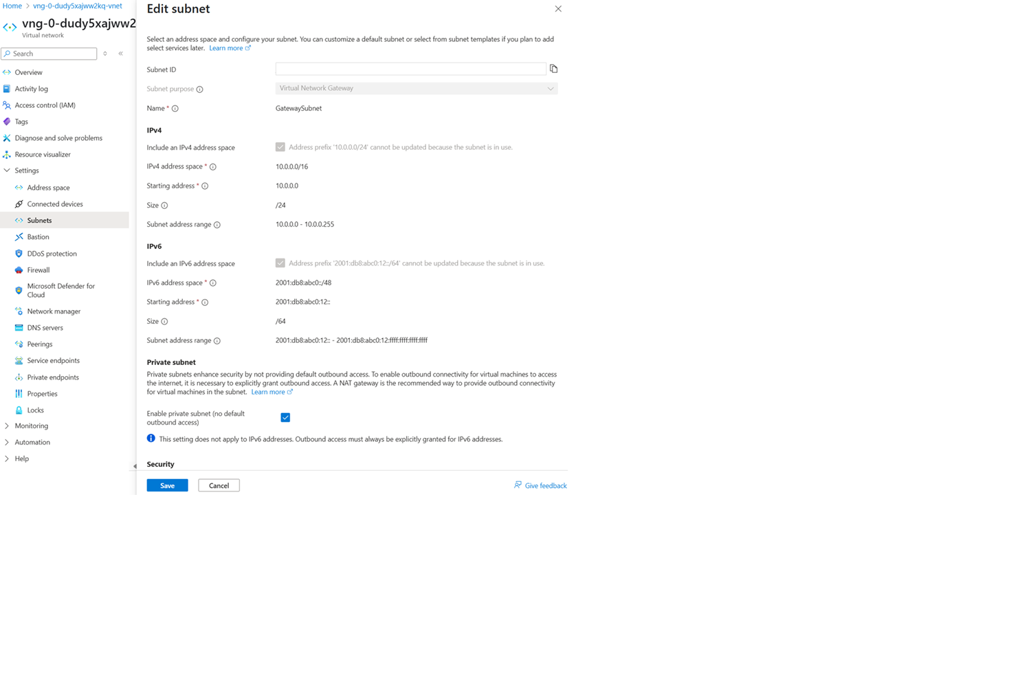 Maak het gatewaysubnet met IPv4- en IPv6-adresbereiken.