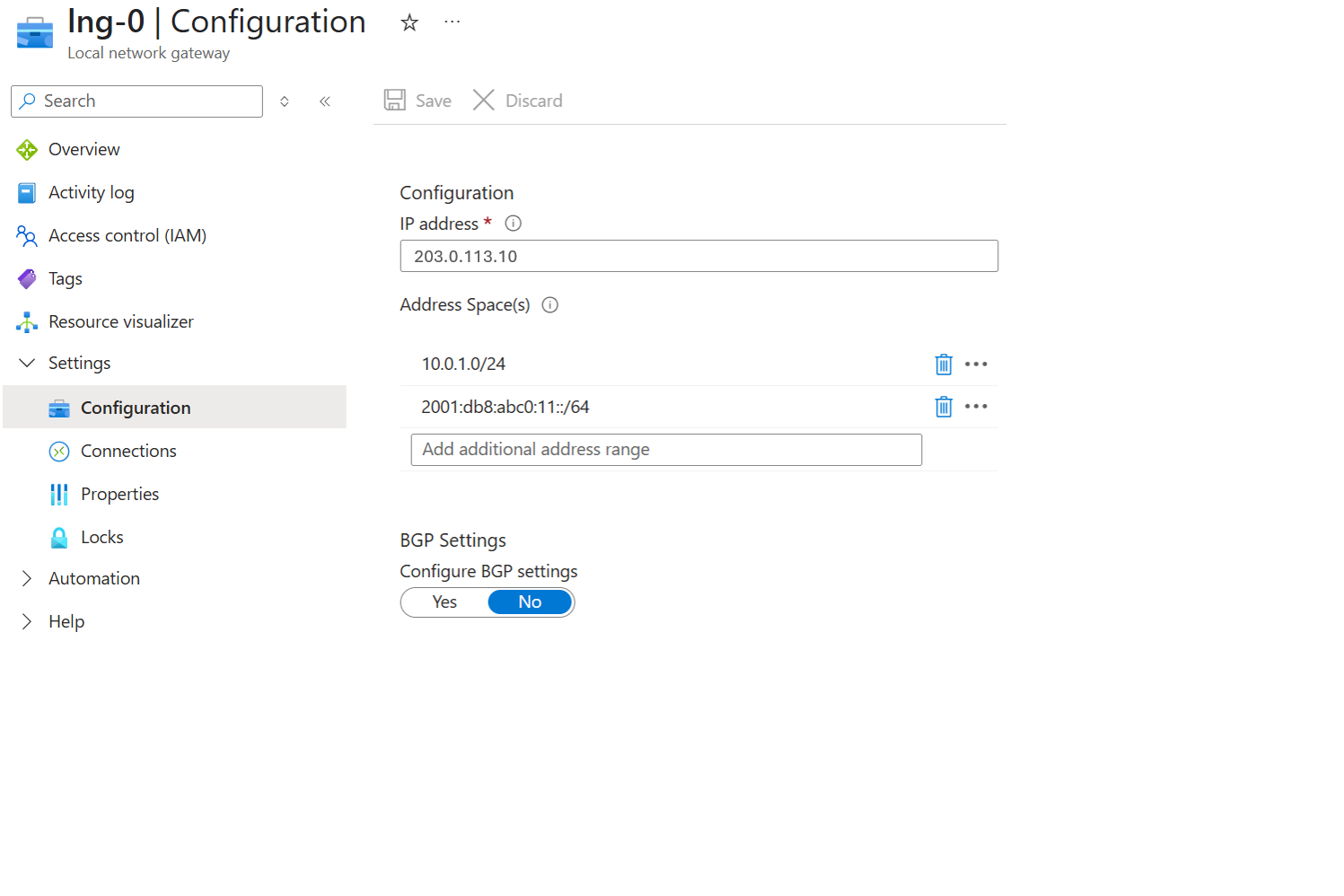 Maak de virtuele netwerkgateway en de lokale netwerkgateway met IPv4- en IPv6-configuratie-instellingen.